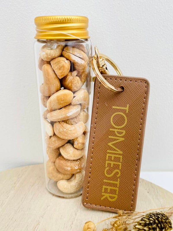 Een lekker, maar ook een praktisch geschenk! Dat is onze tube gevuld met nootjes of snoepjes in combinatie met een praktische sleutelhanger!