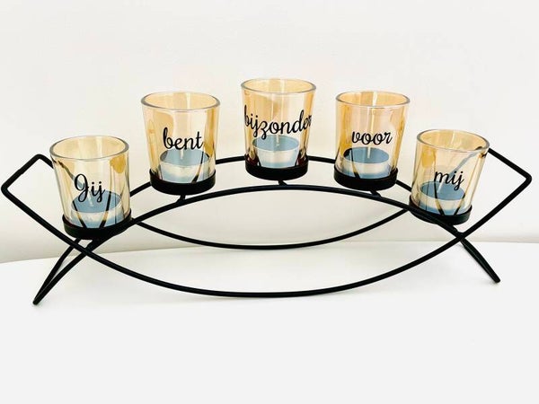 - 3 theelichtjes: 25cm lang x 15cm hoog
