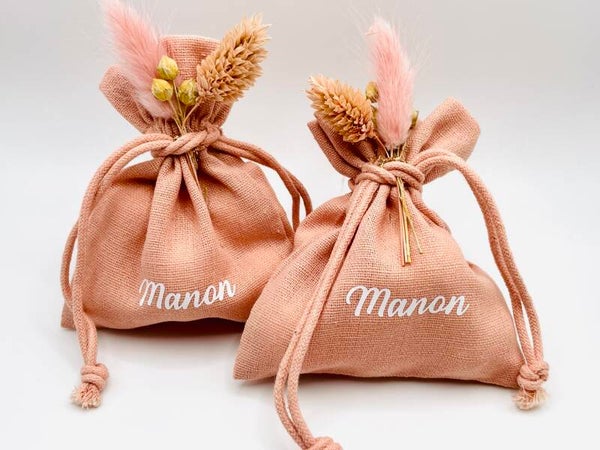 Een eenvoudig, mooi stoffen zakje met trektouw. Het zakje kan gevuld worden met suikerbonen, bruisballen of andere snoepjes. Trek de lintjes aan en werk het geheel af met een label of gedrukte naamsticker.