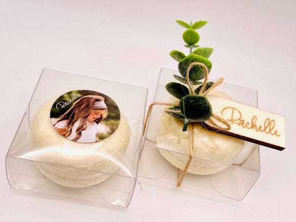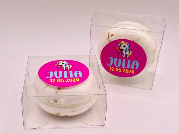 Neen, ook al ziet hij er heerlijk uit, deze macaron is niet om op te eten! Het is een heerlijk geurende bruisbal verpakt in een mica doosje! Afwerking naar keuze!