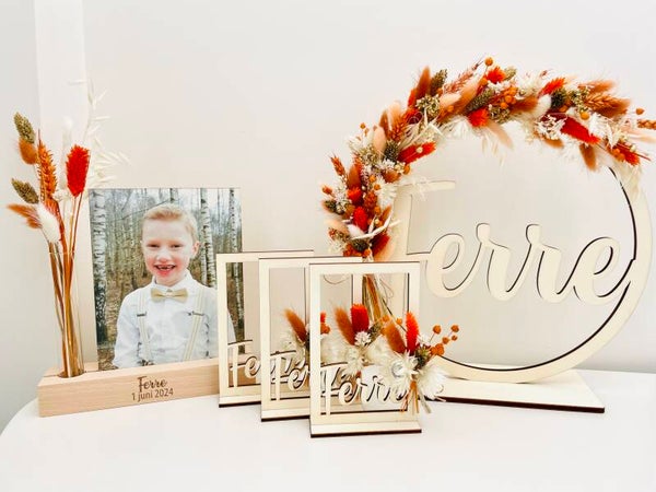 Een houten kader met aan de onderkant naam naar wens! De kader kan afgewerkt worden met een klein bosje droogbloemen .