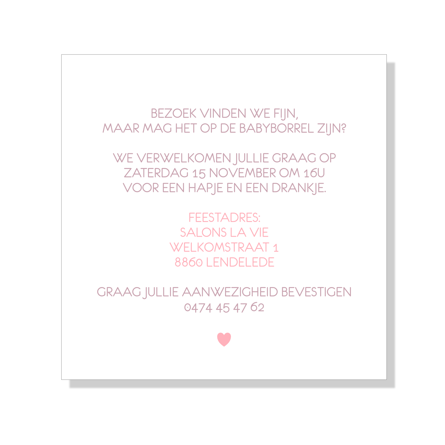 Eenvoud siert dit babyborrelkaartje! De naam van jullie kleintje staat centraal op de uitnodiging voor zijn of haar babyborrel. Deze uitnodiging past bovendien bij vrijwel elk geboortekaartje!