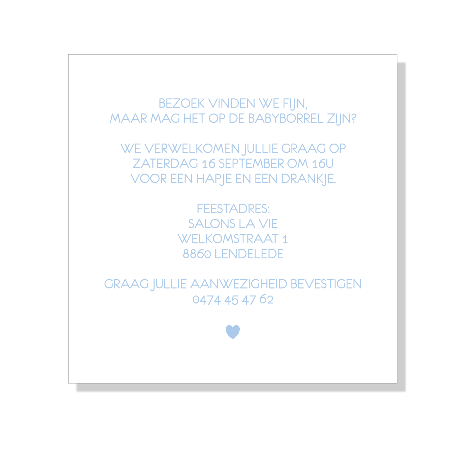 Eenvoud siert dit babyborrelkaartje! De naam van jullie kleintje staat centraal op de uitnodiging voor zijn of haar babyborrel. Deze uitnodiging past bovendien bij vrijwel elk geboortekaartje!