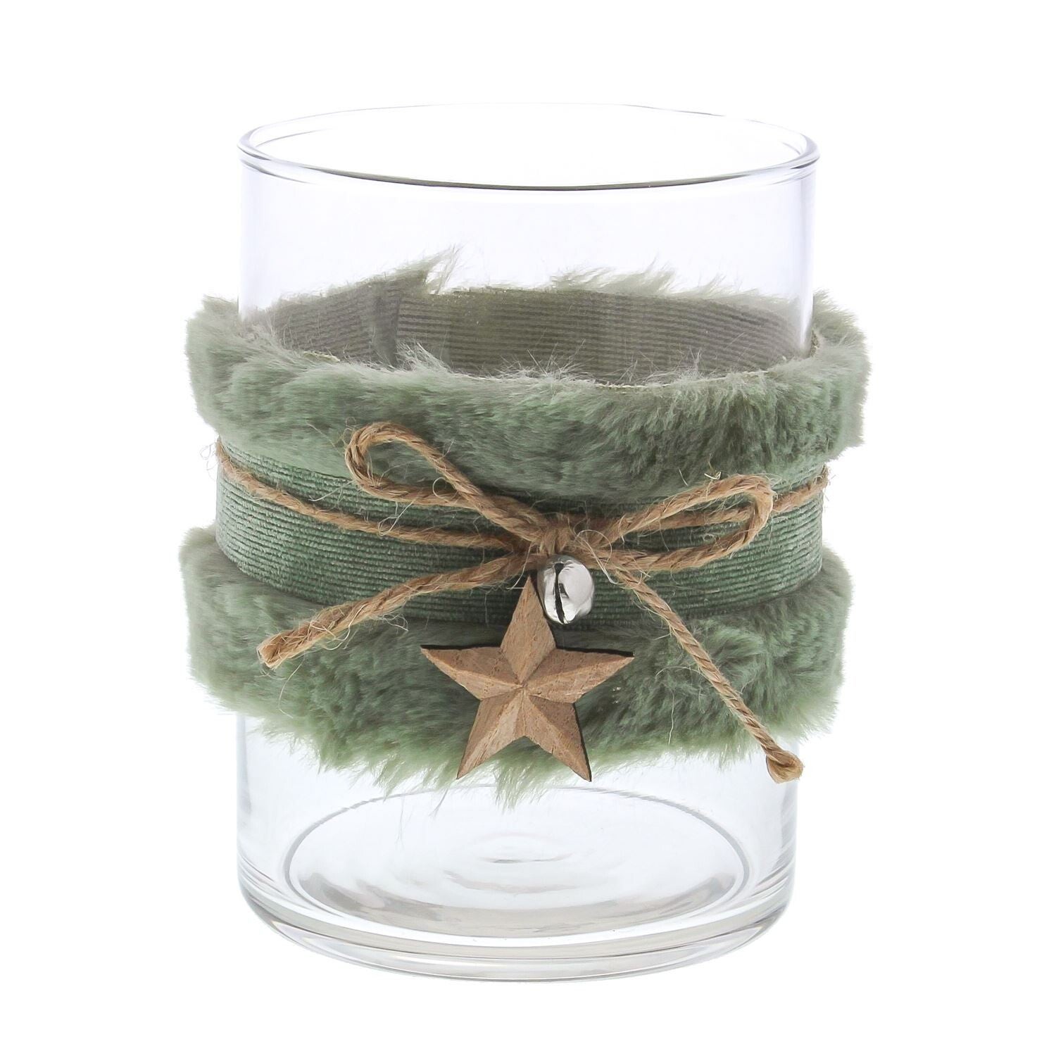 Deze glazen stolp wordt warm gehouden met een pluche decoratiedeken afgewerkt met jute, houten ster en belletje.