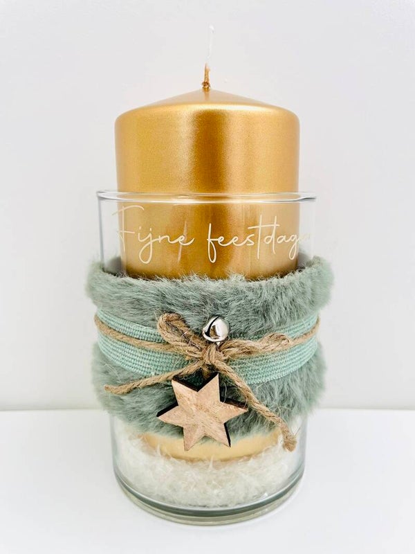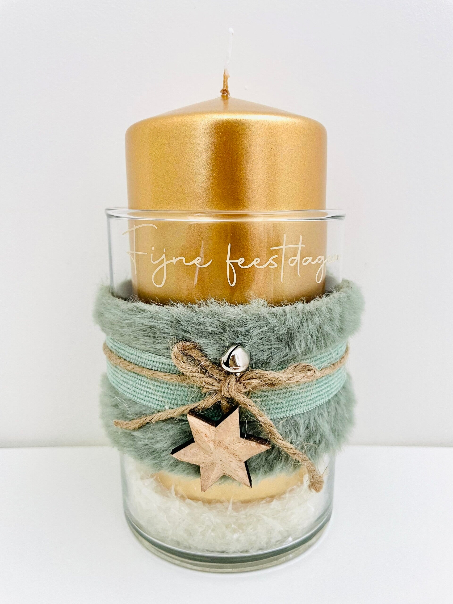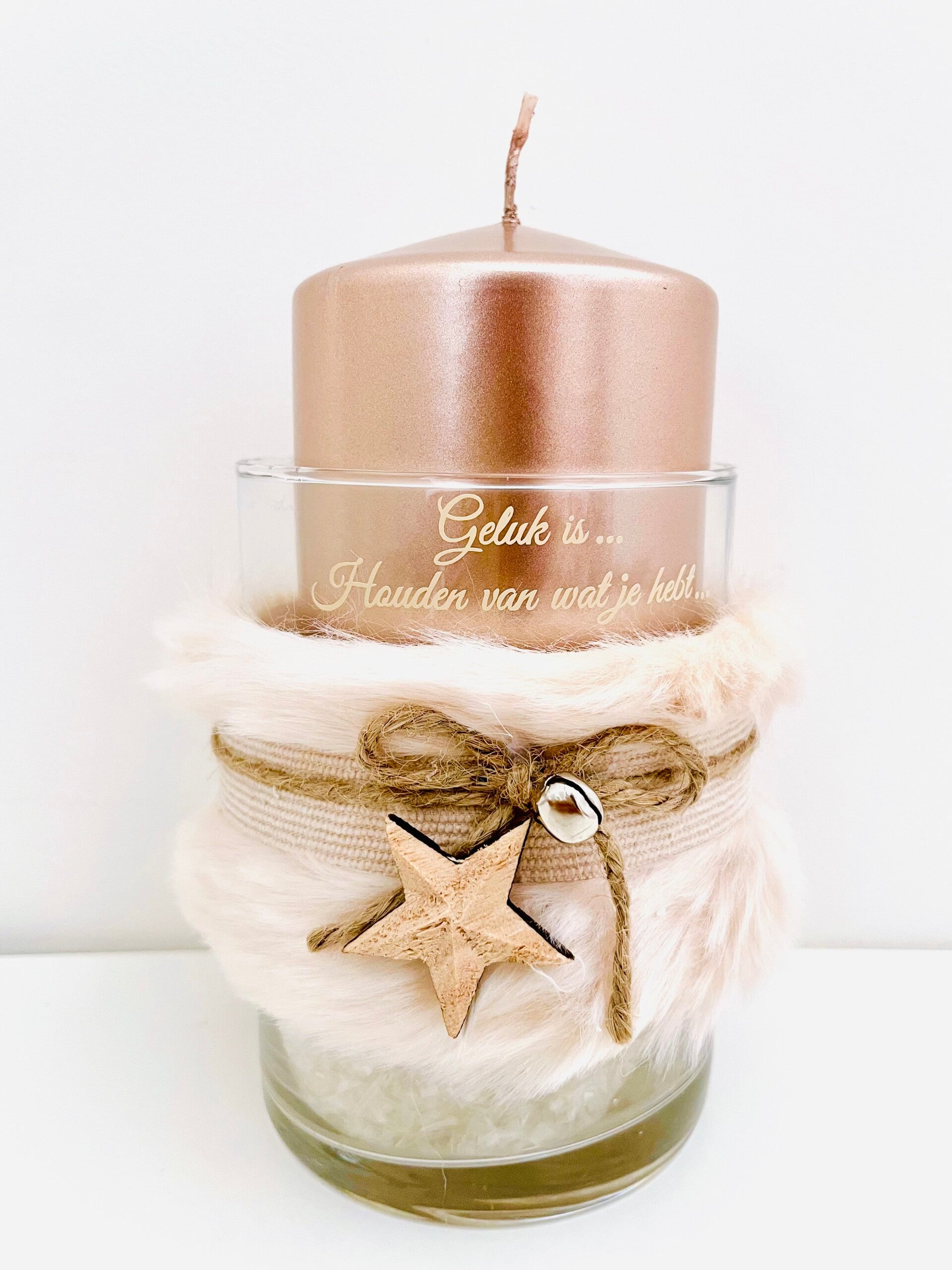 De stolp wordt voorzien van een luxueuze, parelmoerglanzende kaars in goud of roségoud.