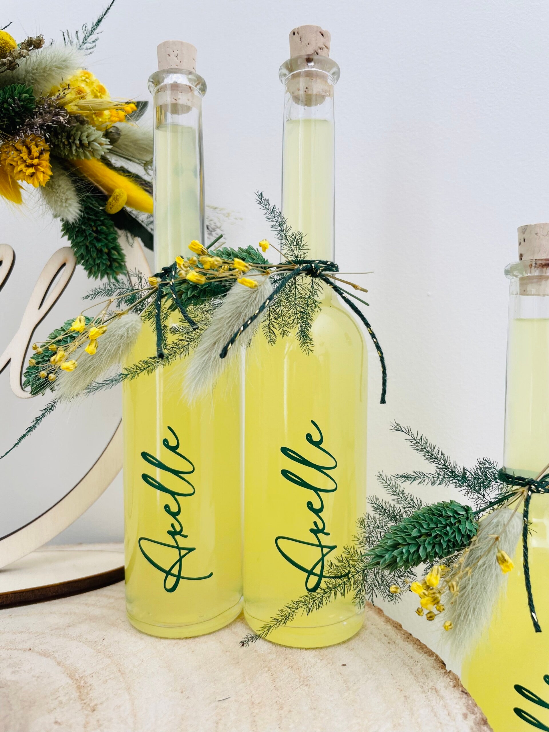 We werken de glazen fles steeds af met een passende naamsticker en, indien gewenst, een strik of droogbloemen.